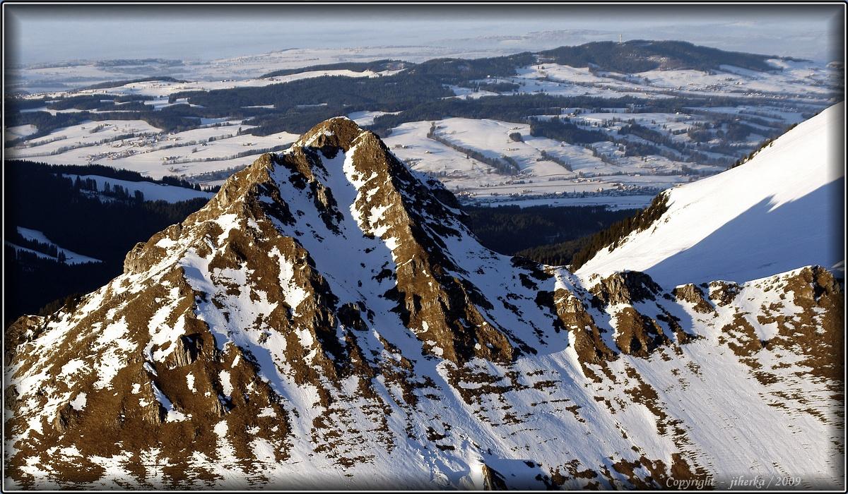 Vue en avion de la Teysachaux avec le Gibloux sur la droite et le lac de Neuchatel dans le fond, qui se trouve suos la brume.